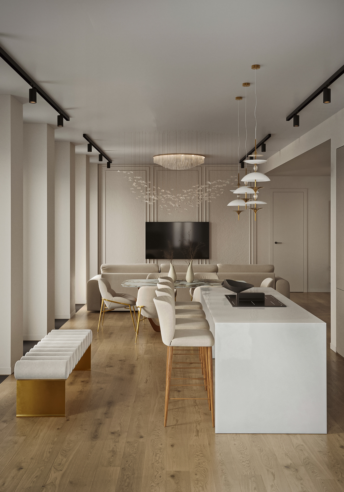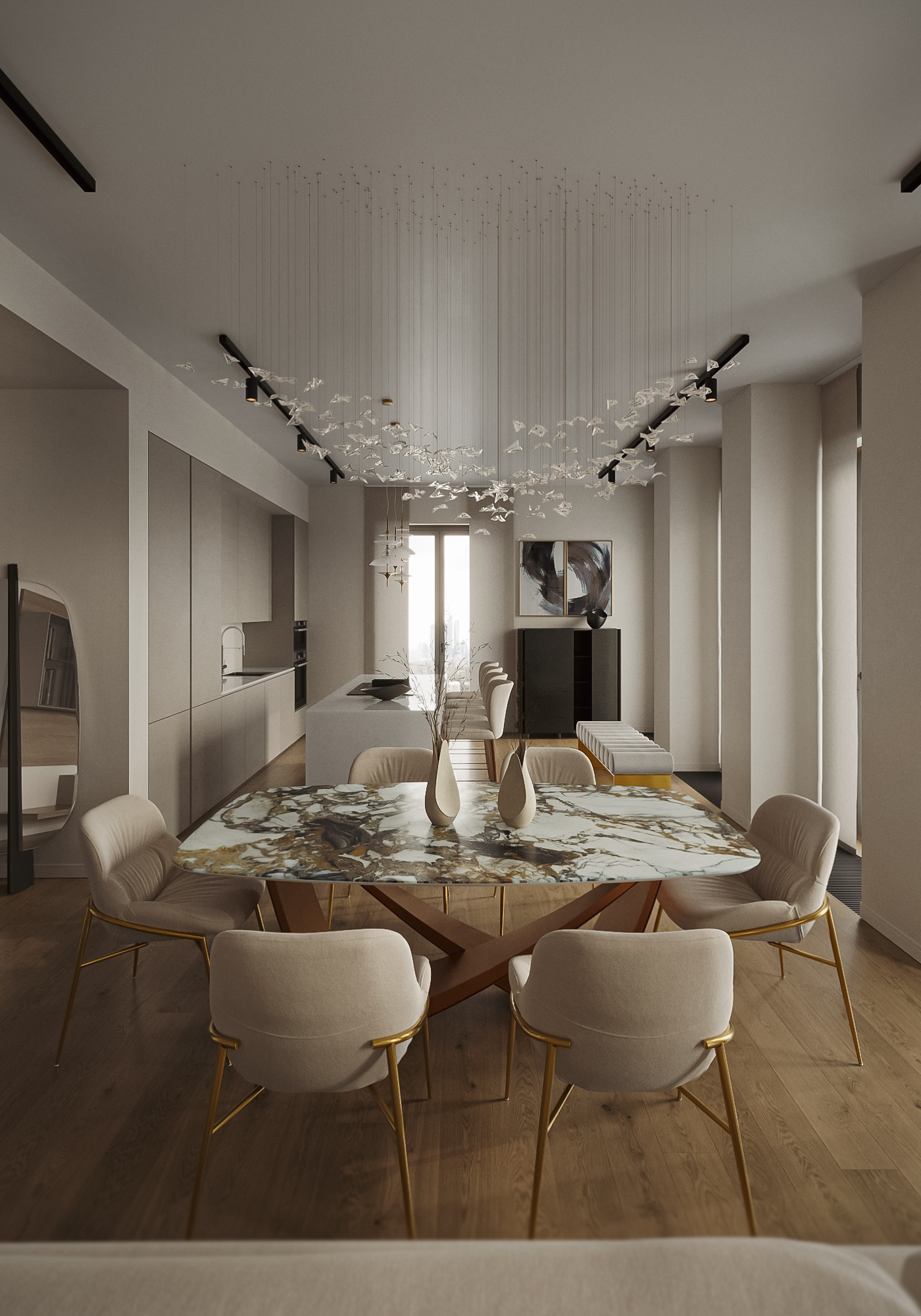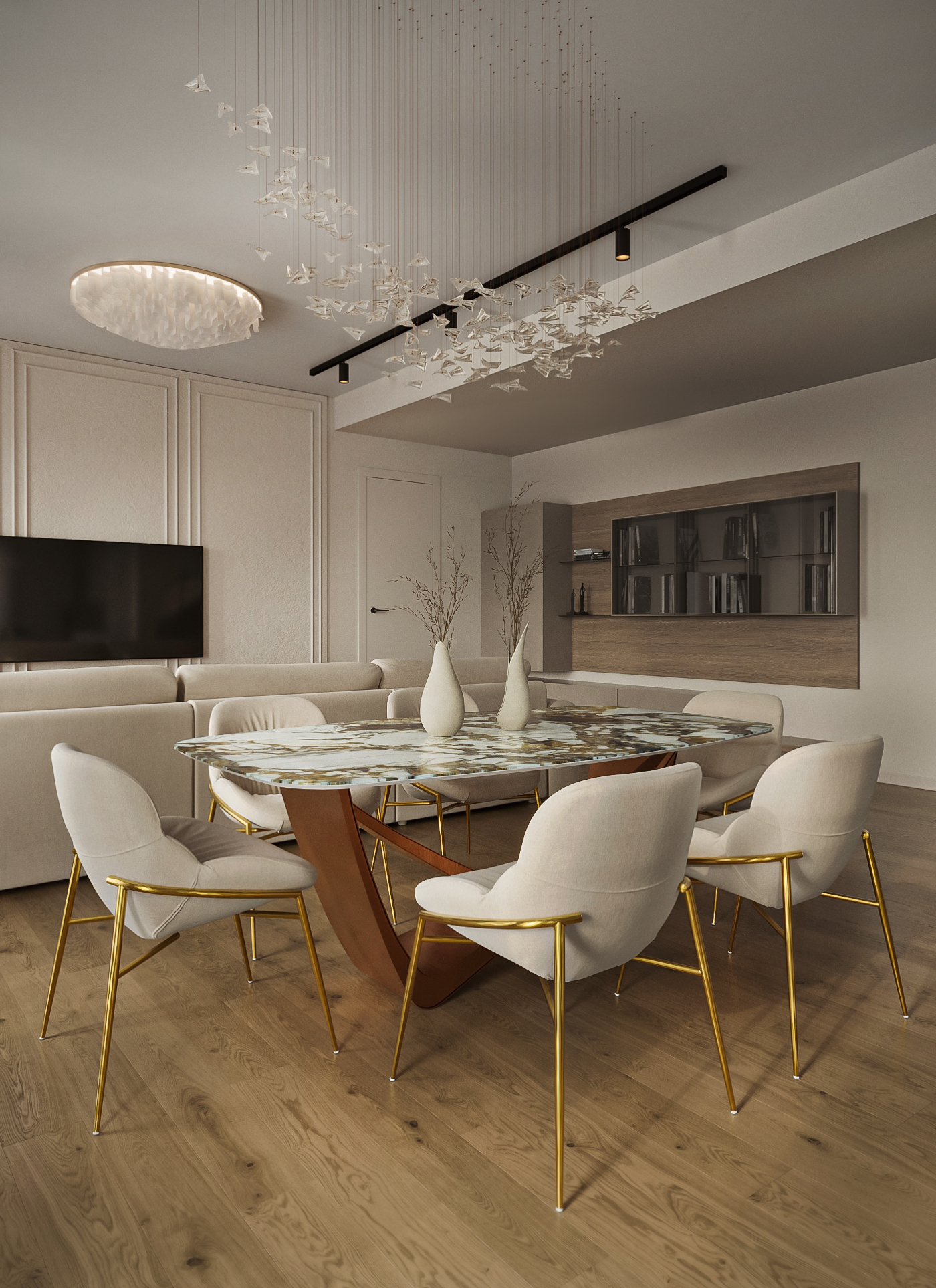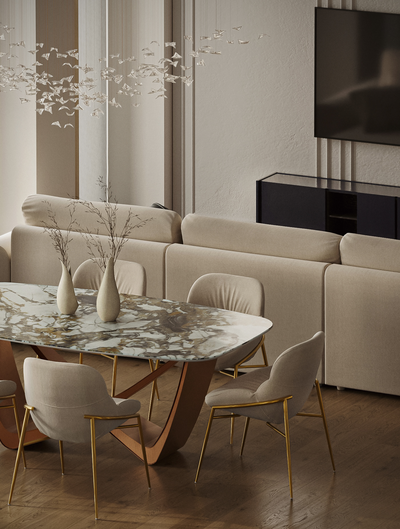 И наполнили помещения теплыми оттенками, а также добавили акценты: графичные темные тона корпусной мебели: комод, тумба для телевизора, библиотека, небольшие лаконичные блюда и др. А глянцевый металл для оснований стола и стульев, медных и латунных оттенков, напоминает лучи заходящего солнца.