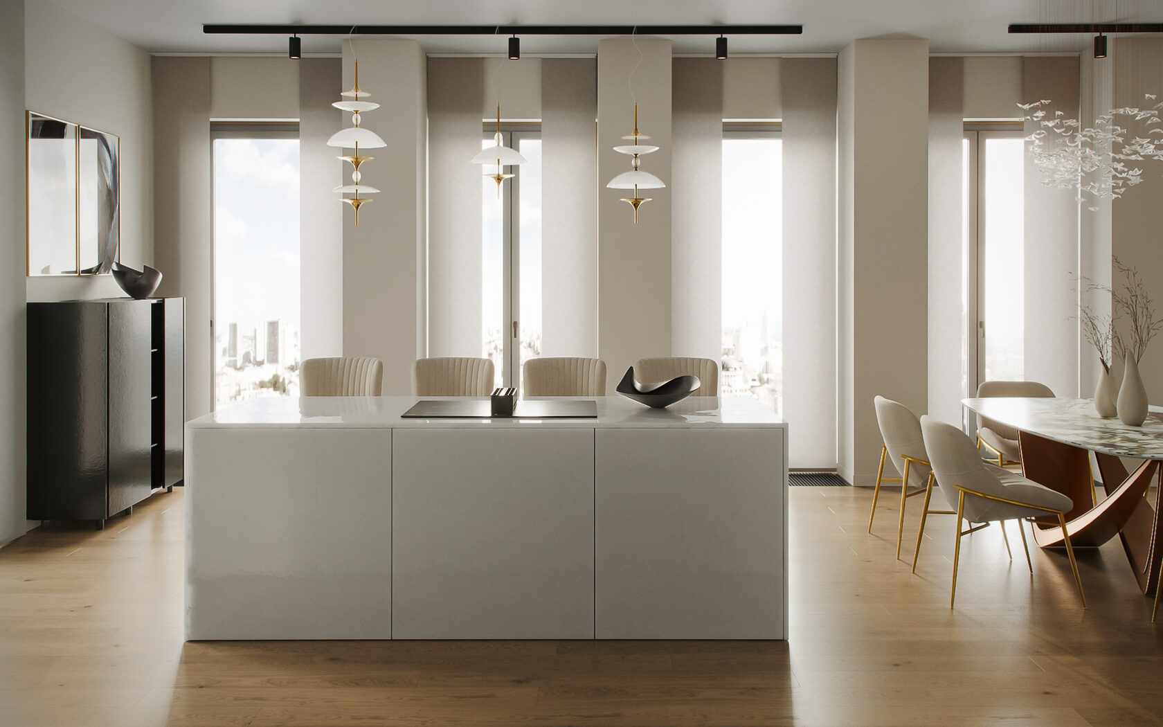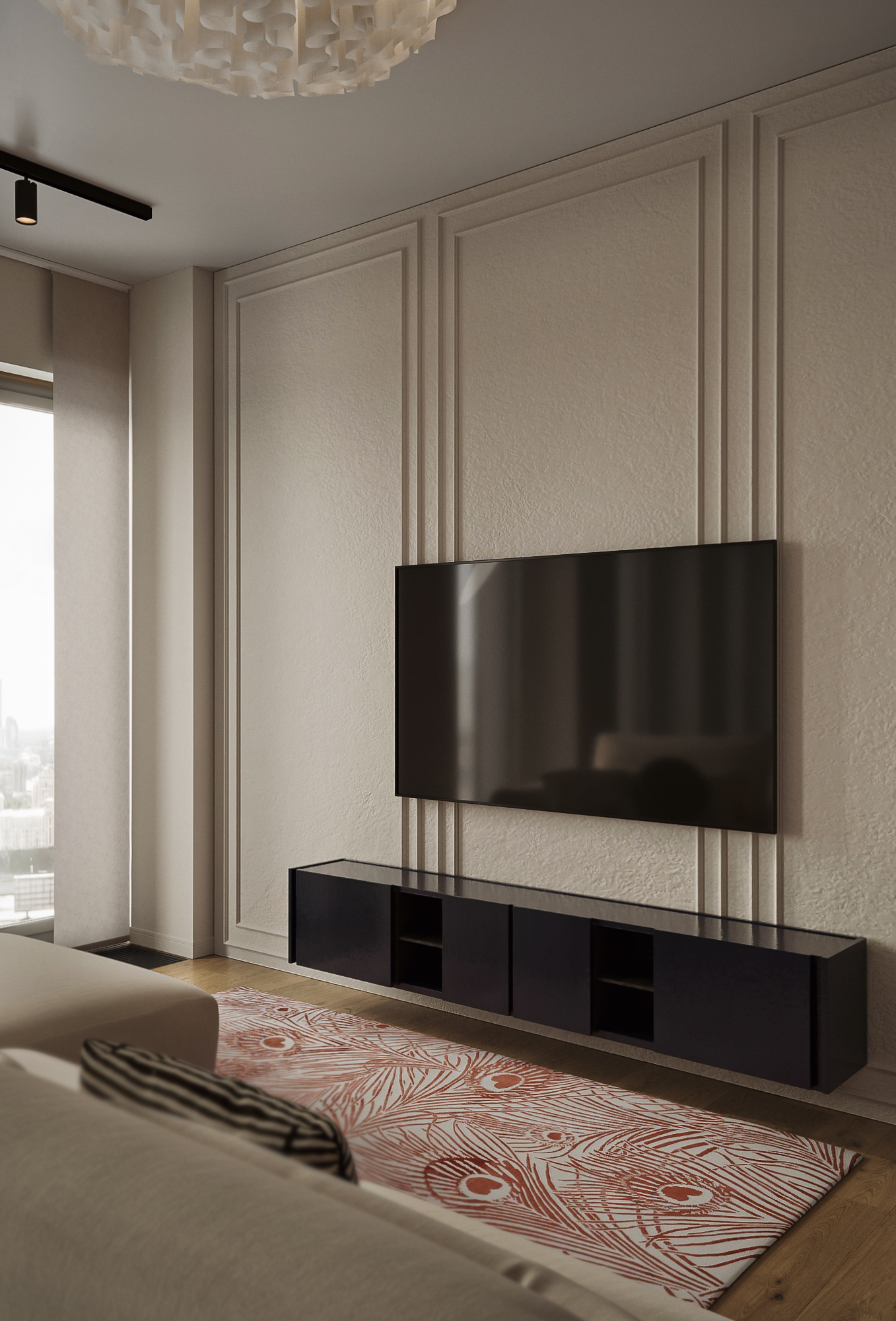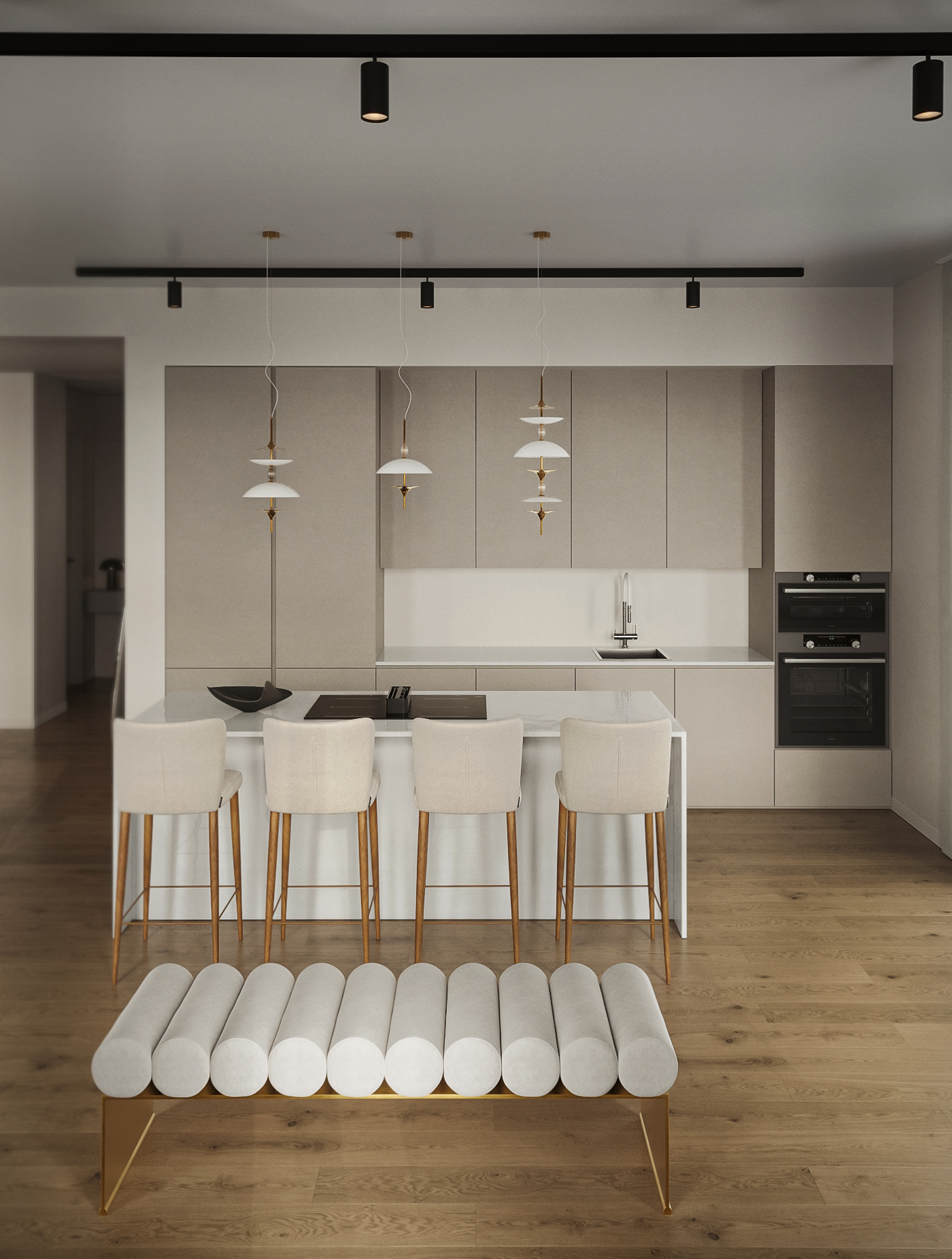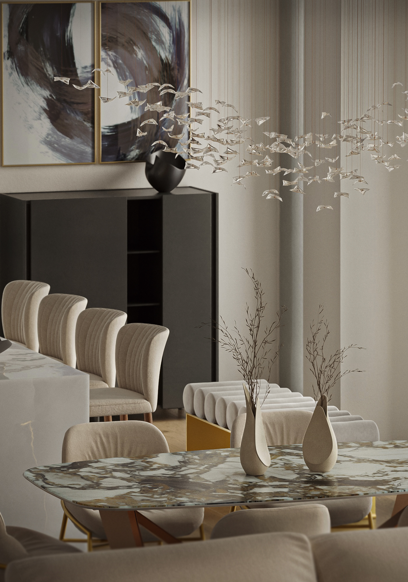 И наполнили помещения теплыми оттенками, а также добавили акценты: графичные темные тона корпусной мебели: комод, тумба для телевизора, библиотека, небольшие лаконичные блюда и др. А глянцевый металл для оснований стола и стульев, медных и латунных оттенков, напоминает лучи заходящего солнца.