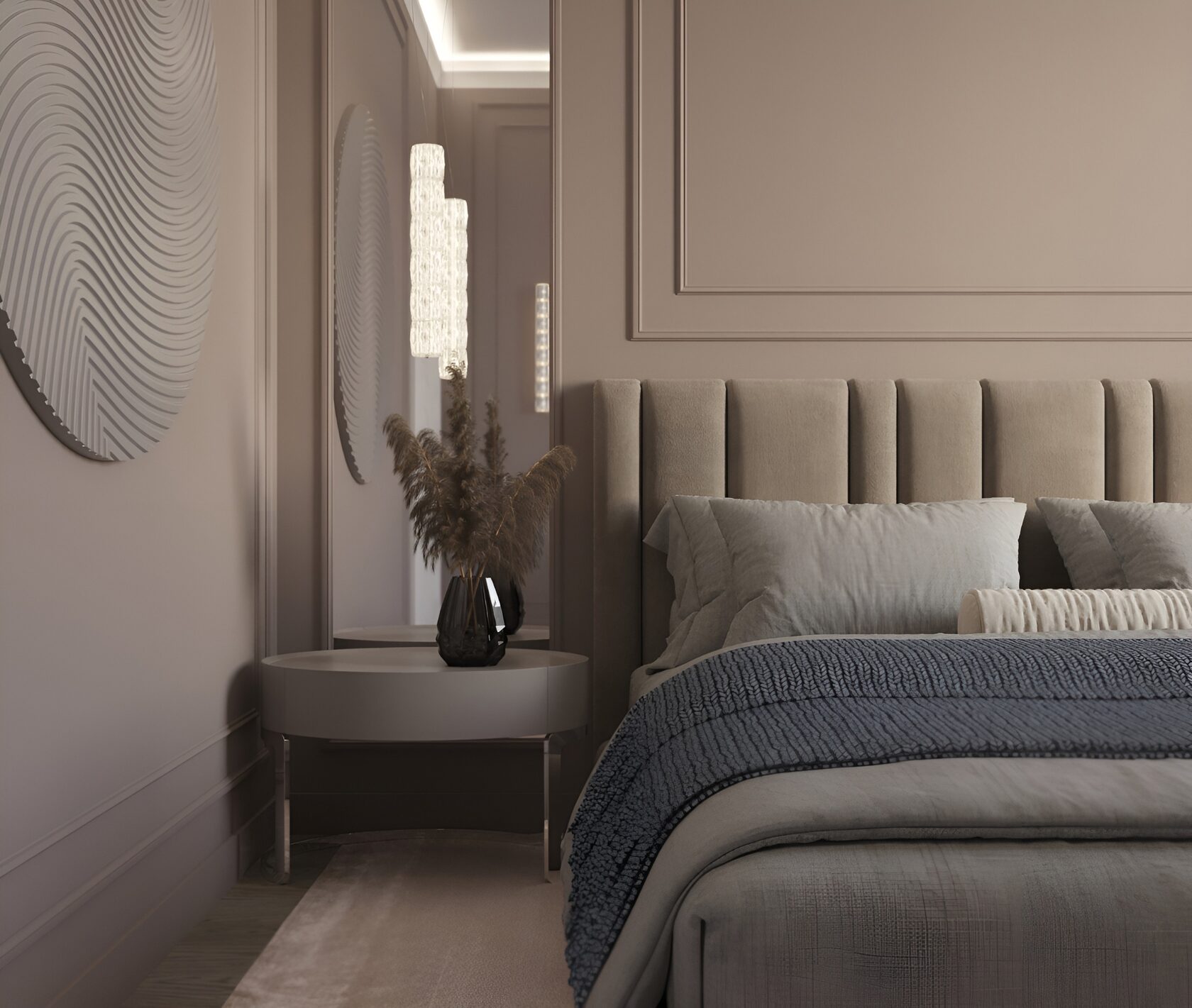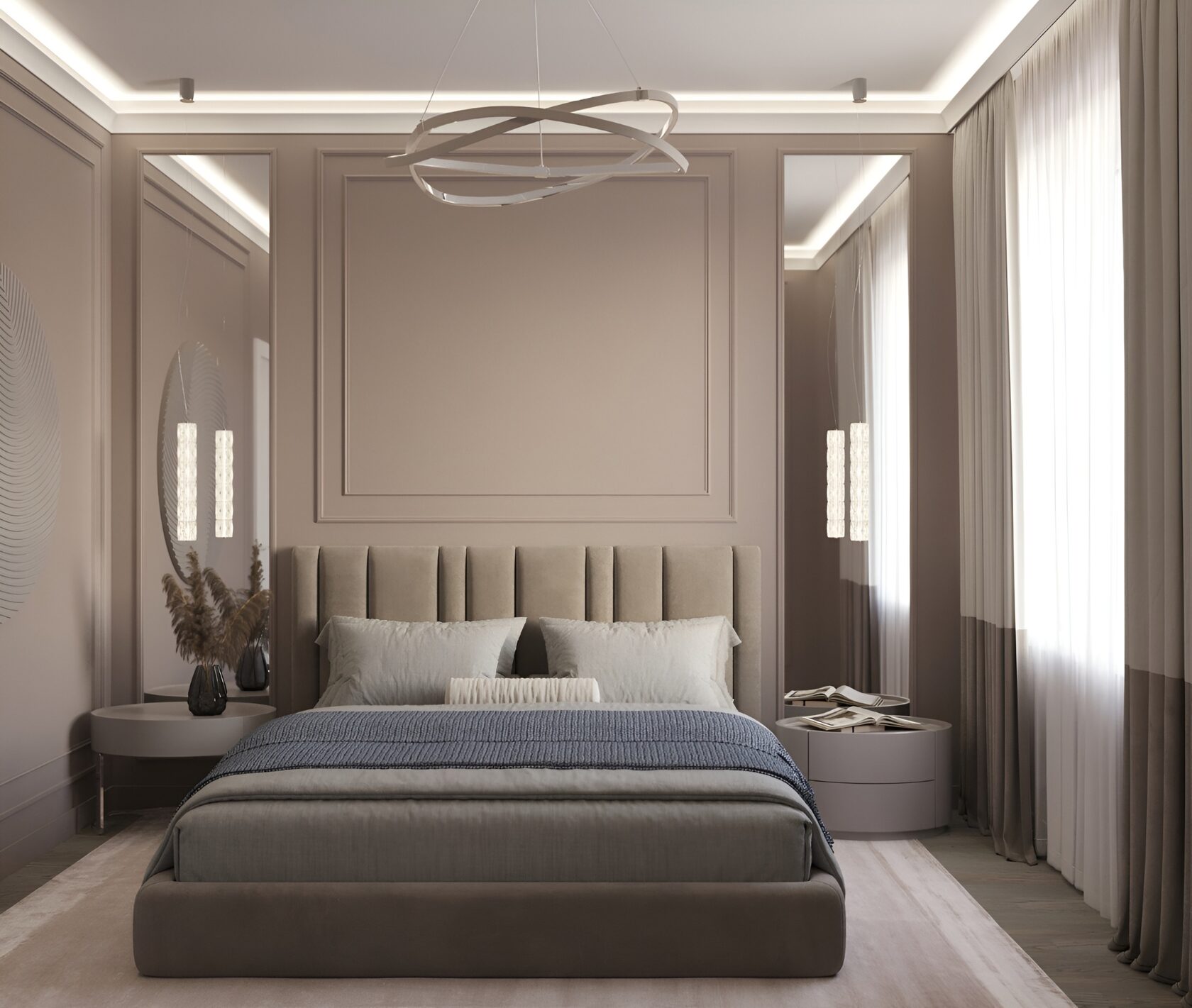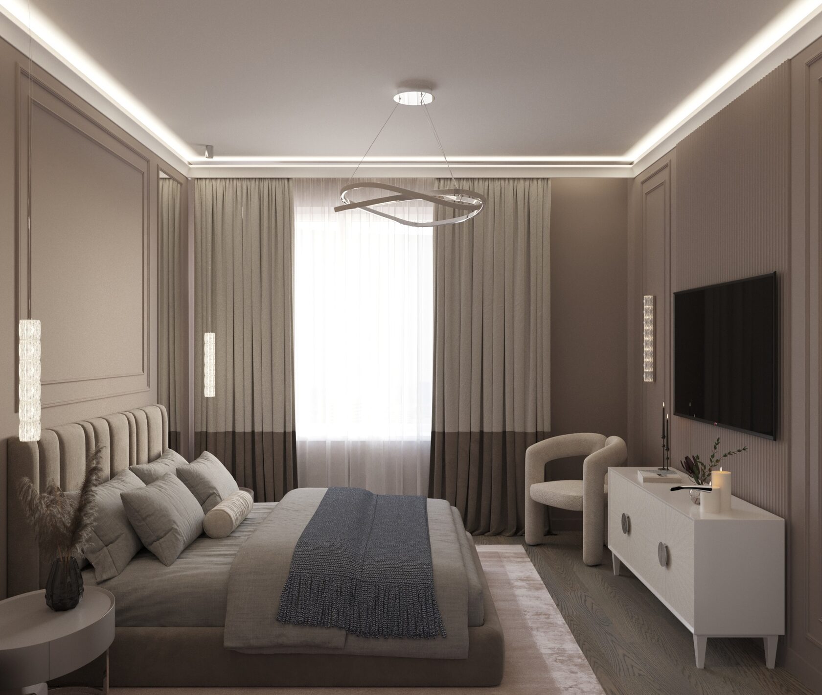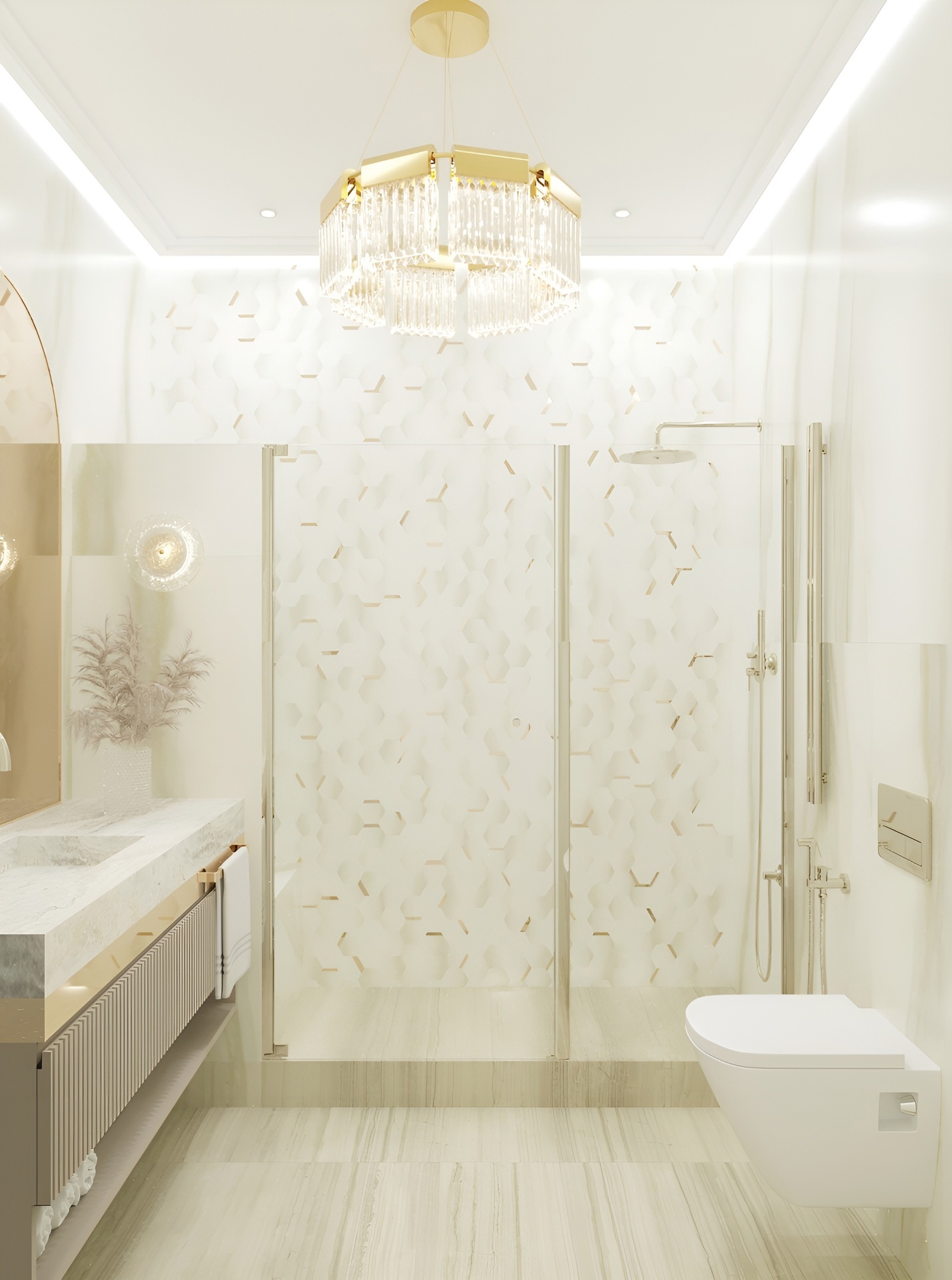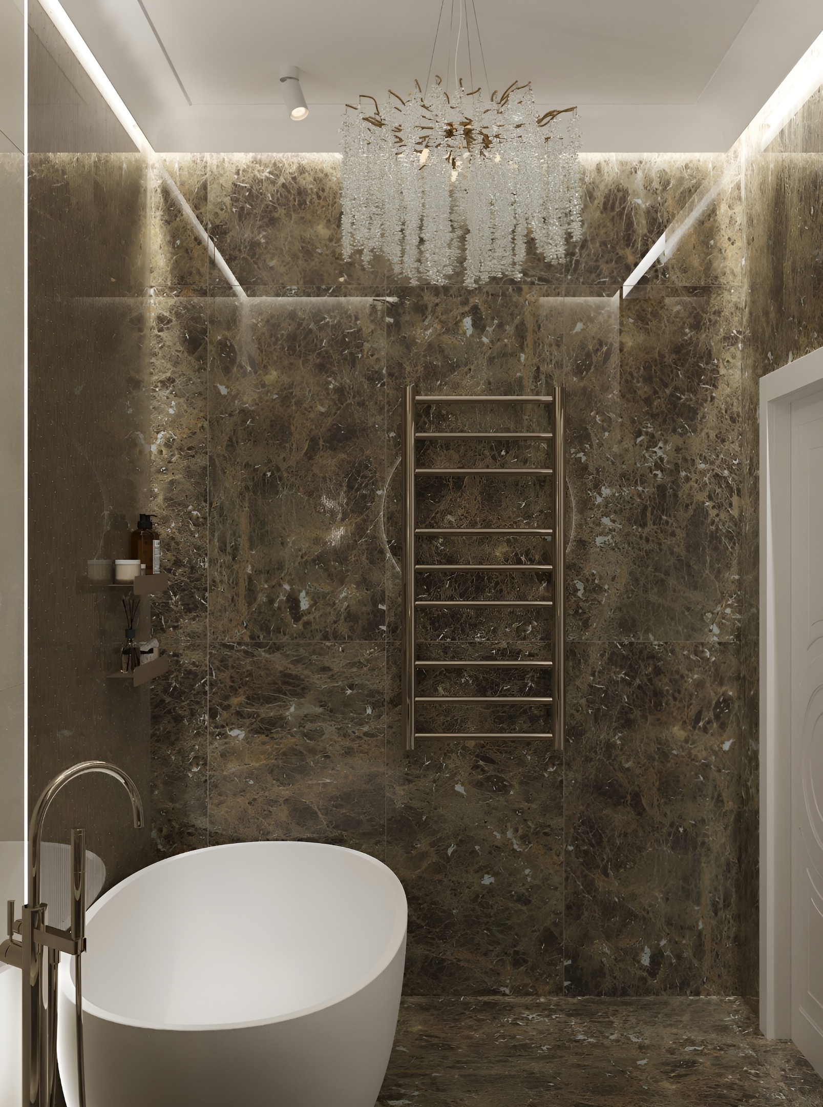Приватная часть квартиры отделена от общей проходной гардеробной. Особенного внимания заслуживает роскошная мастер – ванная с мраморной столешницей, эффектным потолочным светильником и другими знаковыми элементами люксового интерьера. ж