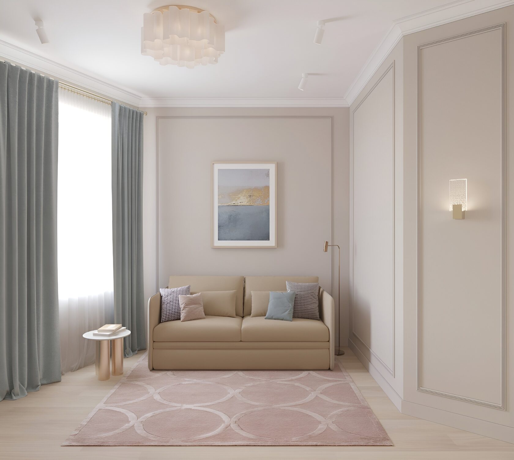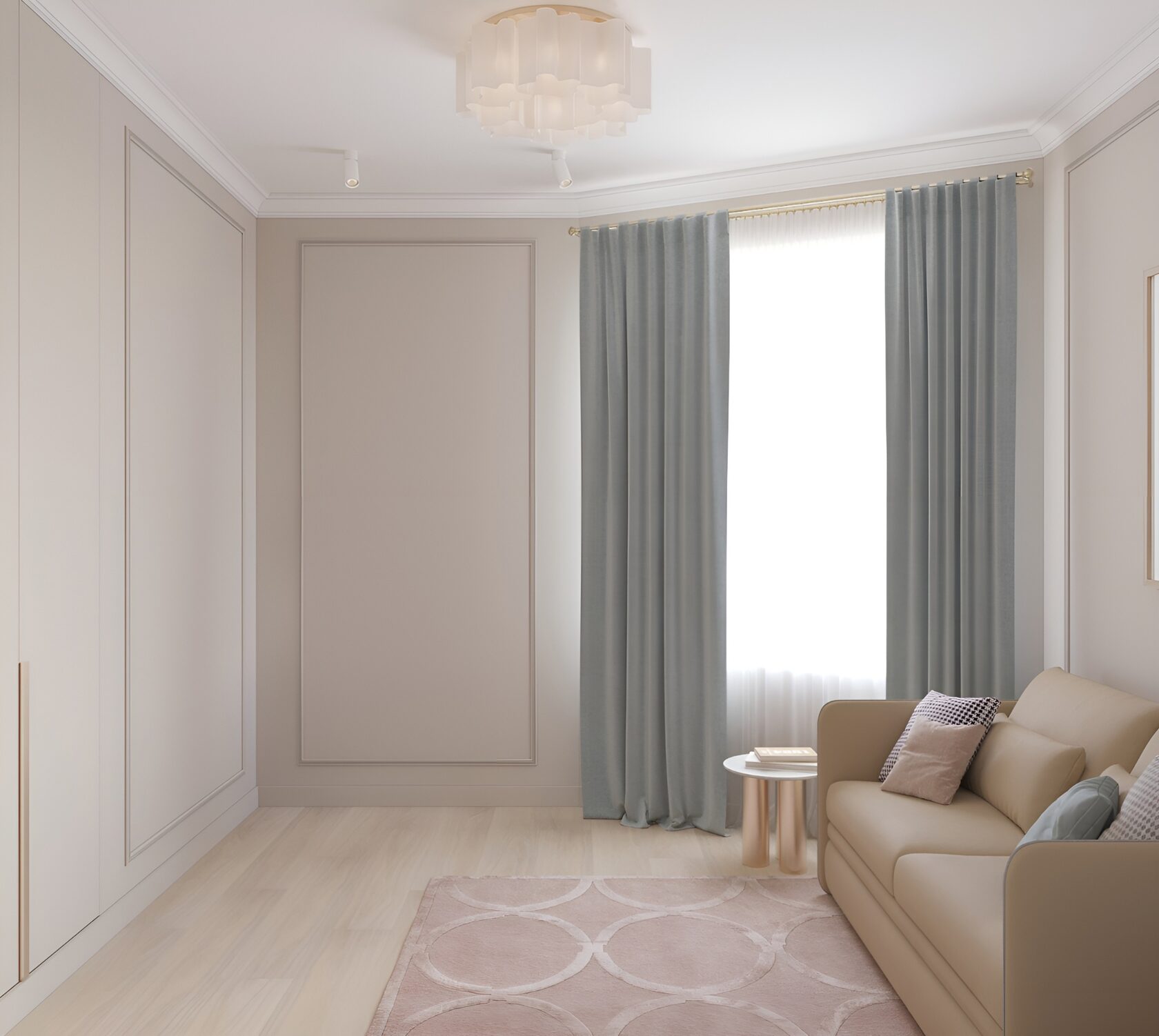 Детская и гостевая также оформлены в нейтральных пастельных тонах без кричащих цветов и тематических рисунков, которыми часто характеризуются детские.