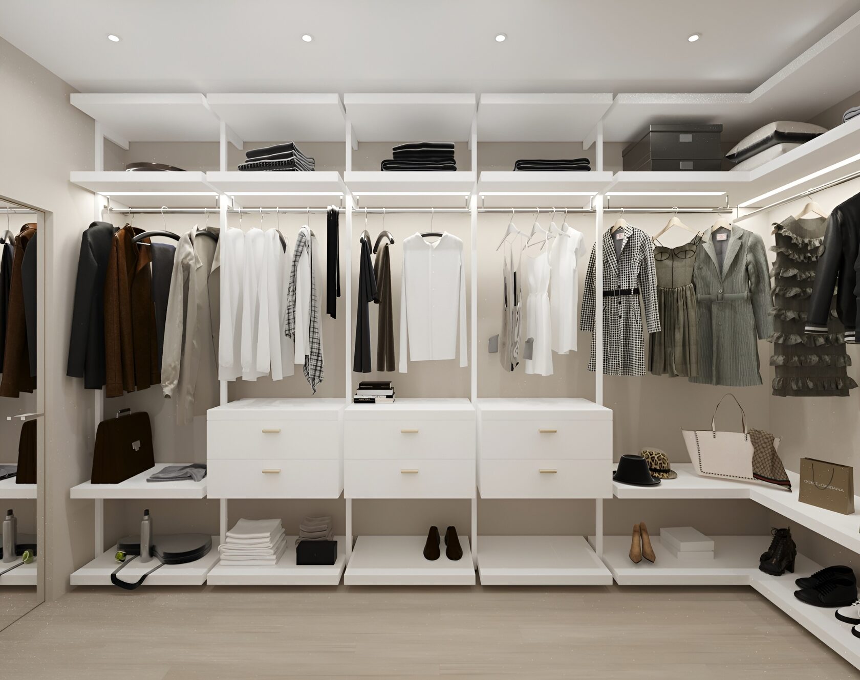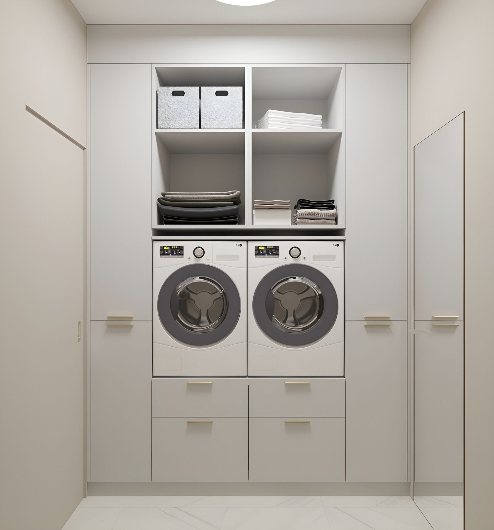 Отдельное внимание в проекте мы уделили хозяйственной зоне, что также архиважно для интерьеров класса люкс. Стиральная и сушильная машина, гладильная доска и другие элементы быта вынесены в отдельное помещение.