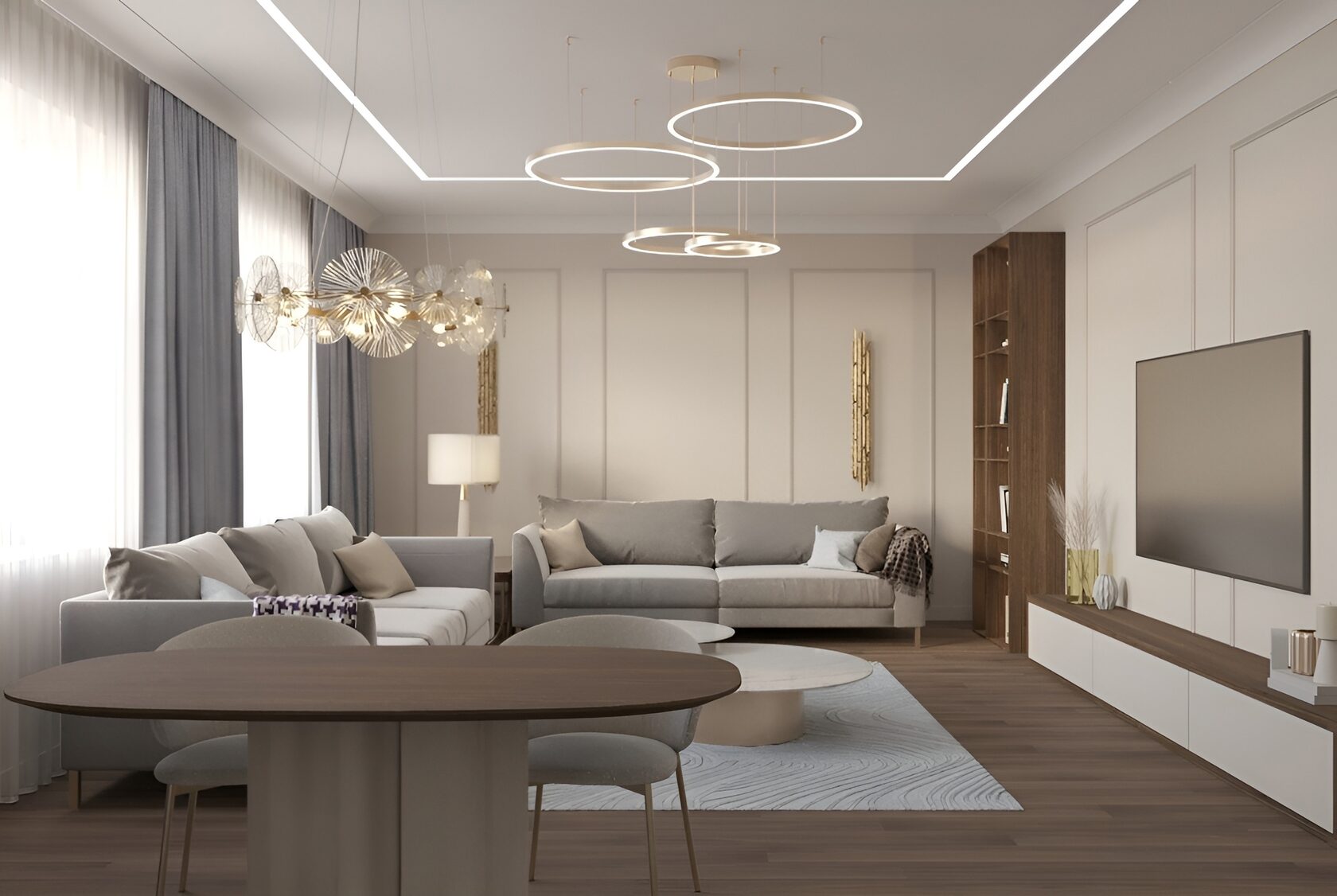Площадь квартиры – 150 кв.м. Здесь не только просторно, но и светло – обилие окон позволяет поймать максимум естественного освещения, и мы усилили этот эффект благодаря грамотному выбору цветовой гаммы. Для всех помещений выбраны спокойные пастельные тона, окутывающие уютом, как кашемировый плед.