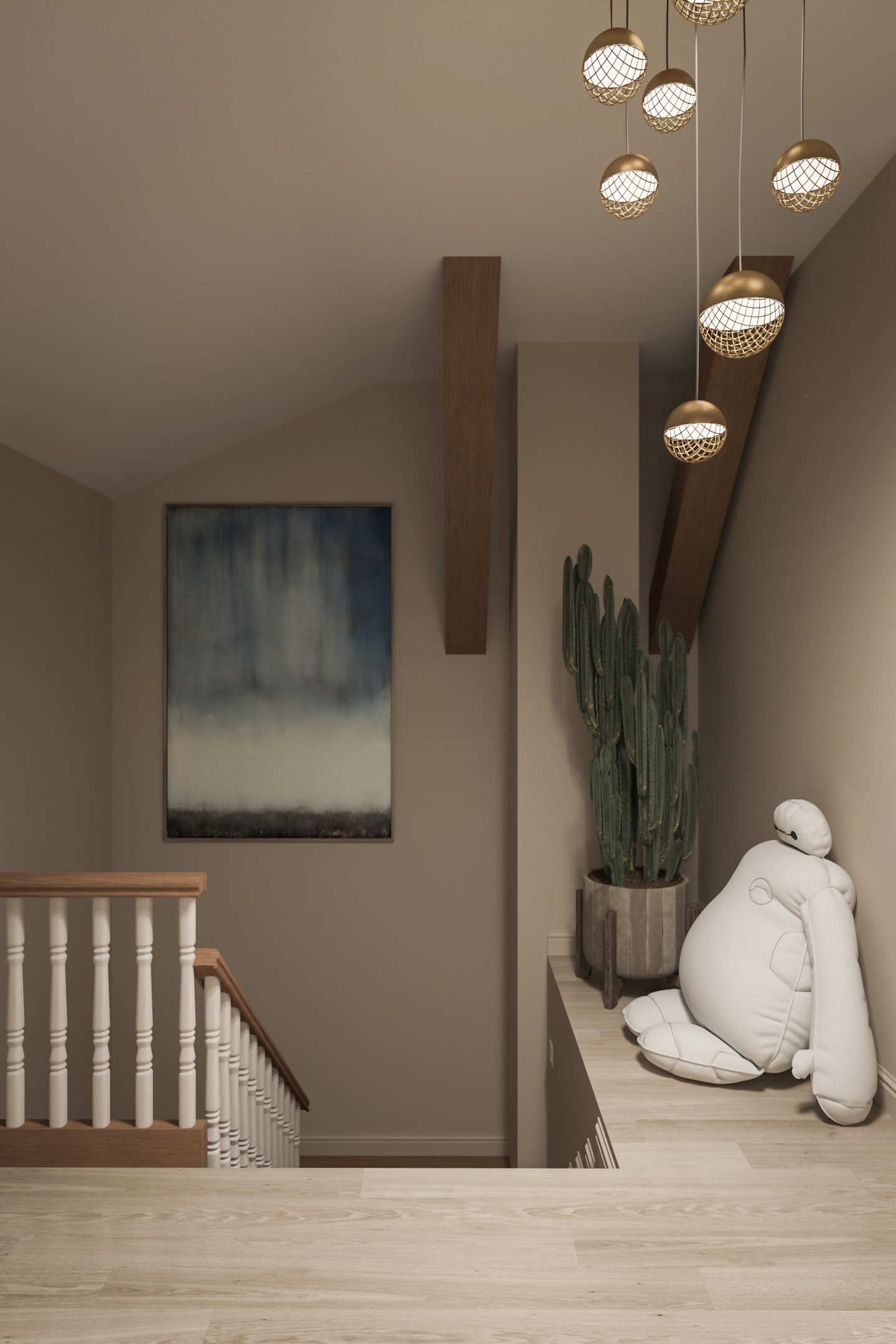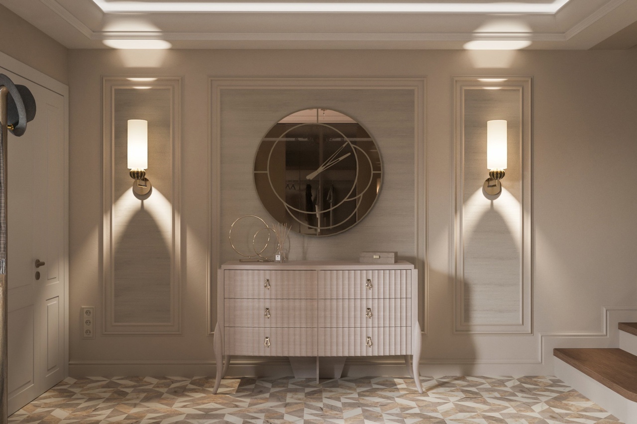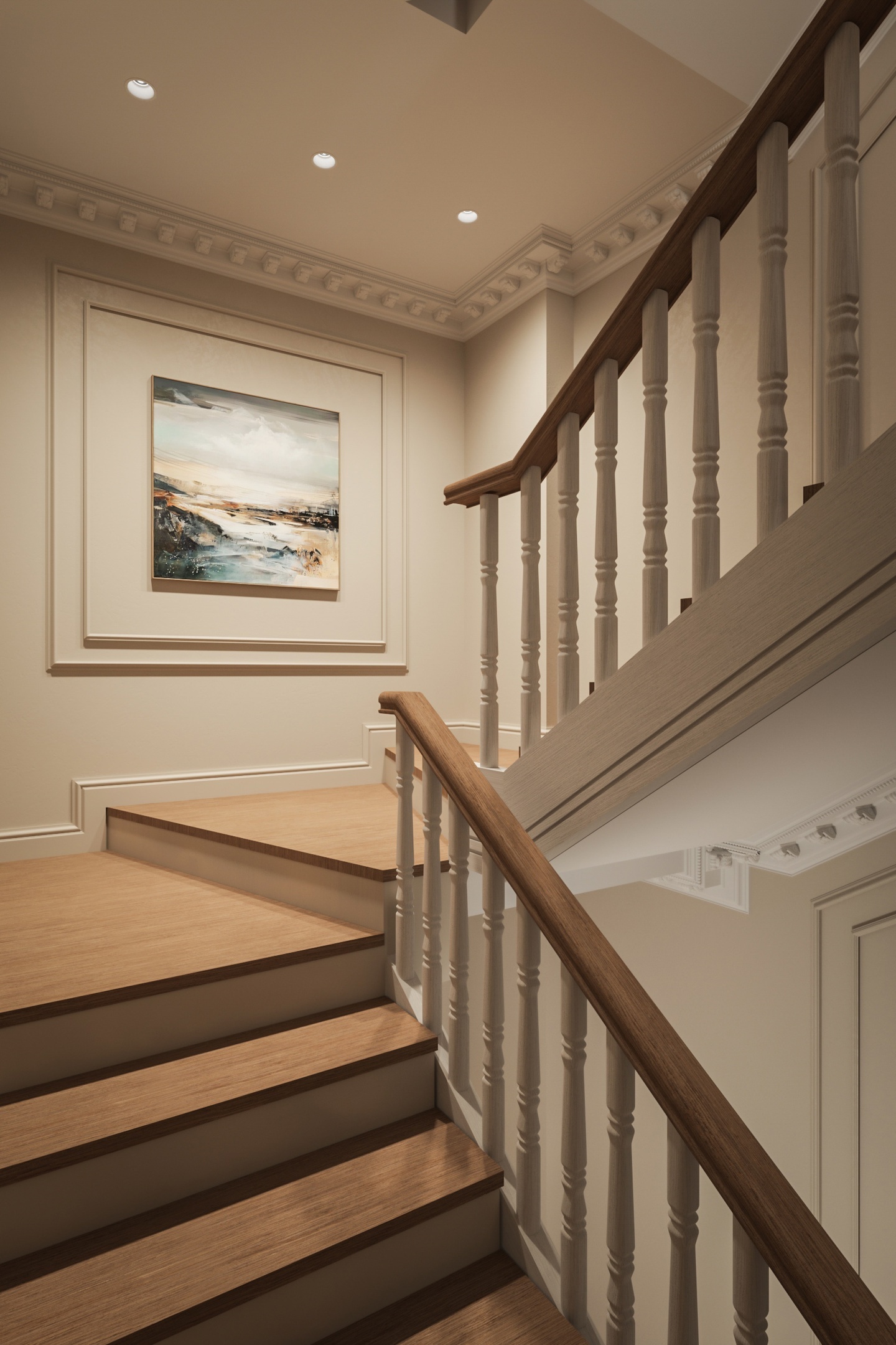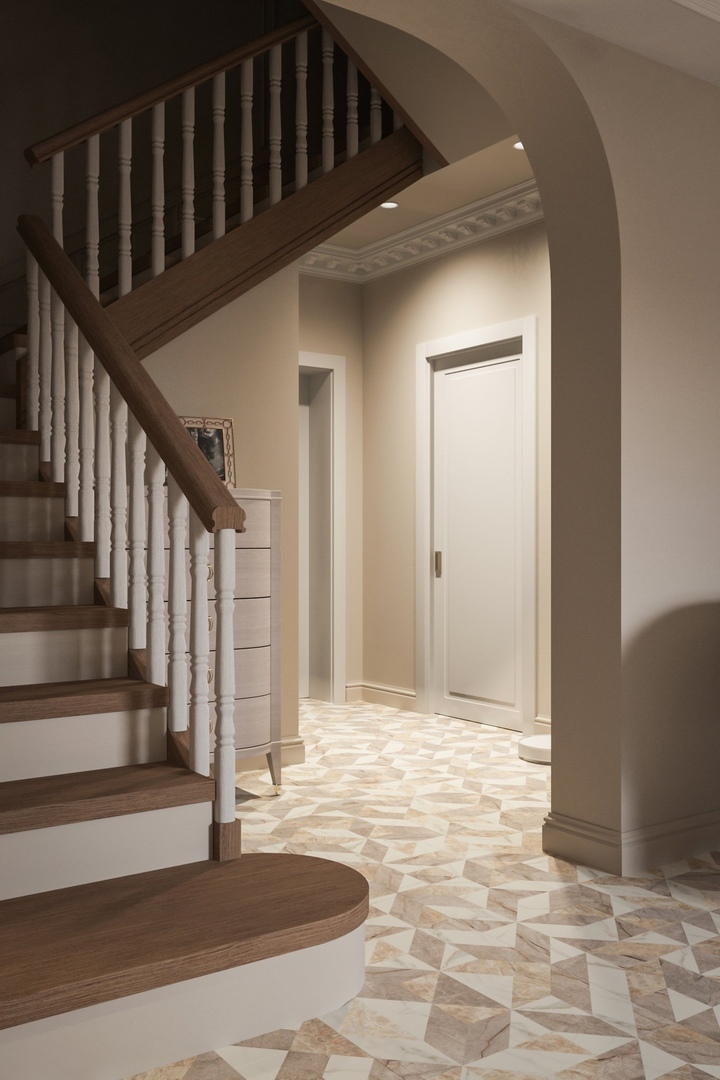 Пролет также должен выглядеть стильно и отражать общую концепцию Вашего интерьера. Здесь мы решили добавить немного классических деталей в виде молдингов на стенах и оставили место под полотна живописи, - несмотря на то, что стены просто покрашены, Ваши глаза будут радоваться, проходя по коридору и интерьерная концепция будет завершенной и гармоничной.
