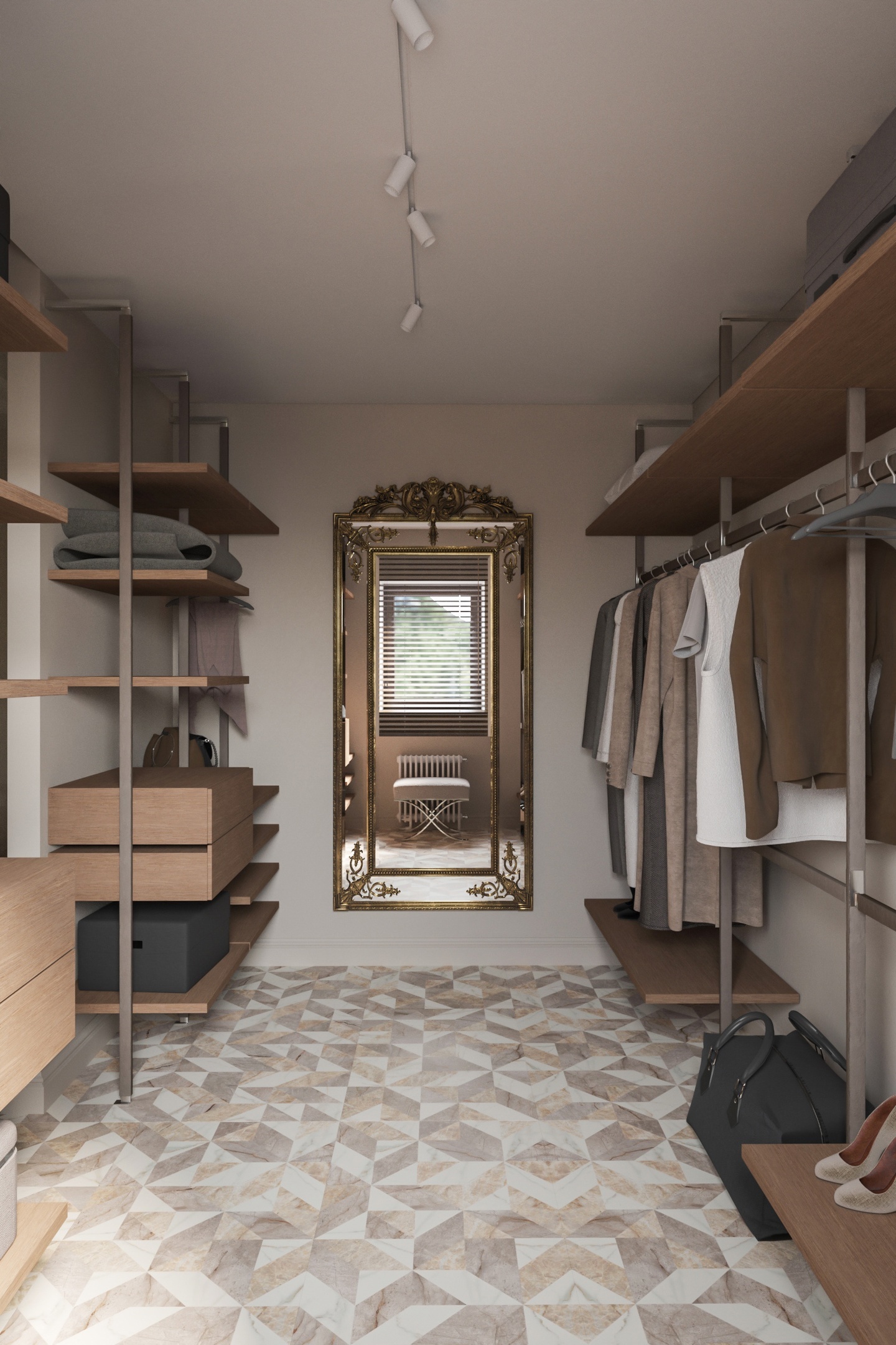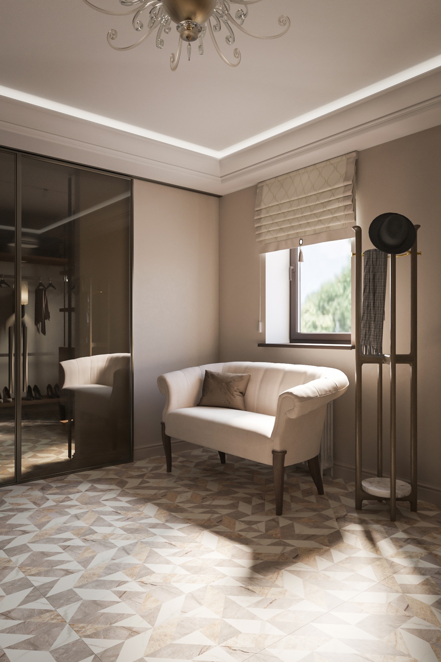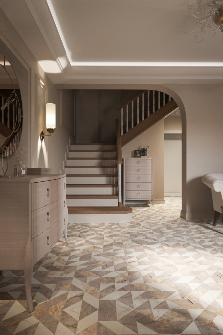 И мы сделали визуализацию первого этажа и поняли, что от старого декора можно и нужно избавляться. Подыскали новый керамогранит в идеальной гамме, согласились, что форма потолка больше не устраивает и гардеробную комнату хотелось бы обновить.