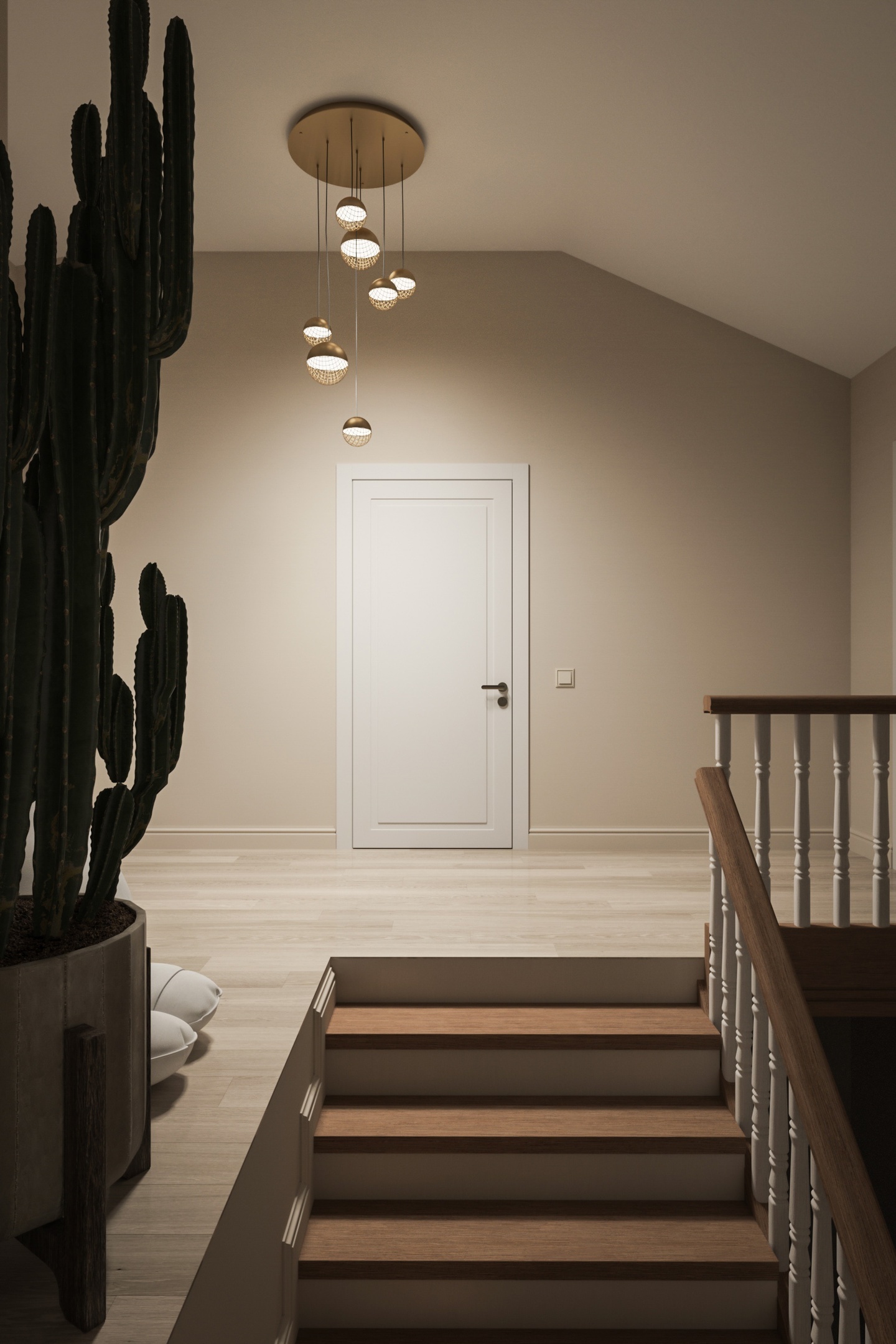 Да и в целом – хотелось добавить шика и лоска в виде жаккардовых вставок на стене, светильников из муранского стекла – чтобы создать особую атмосферу изысканности, утонченности и при этом уюта и тепла сразу при входе в дом. Ведь это главное, - когда переступаешь порог с улицы – должна быть магия с первого взгляда. А первый взгляд – на холл и лестничный пролет, что и является визитной карточкой хозяев.