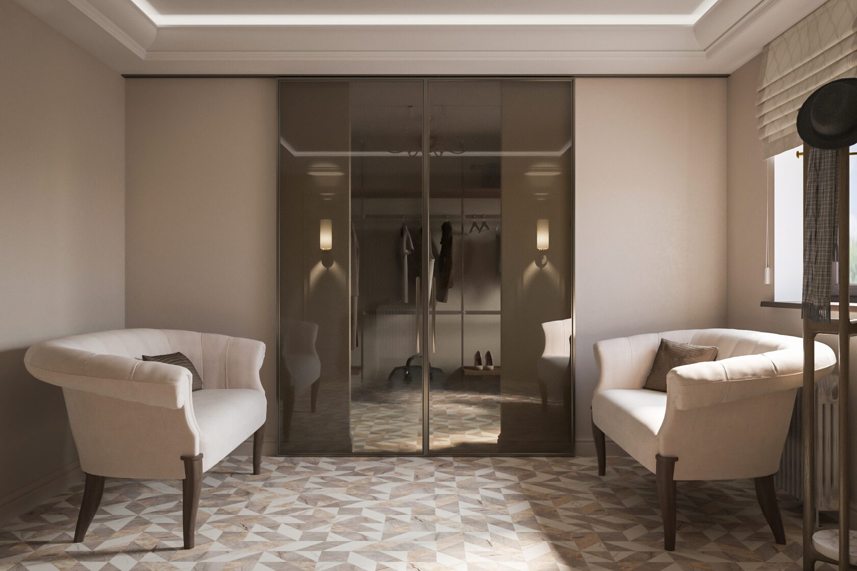 Интерьер получился не только шикарным, но и очень функциональным, - мы все продумали до мелочей. Большой вместительный гардероб с раздвижной дверью, также у нас спряталась за гардеробом хозяйственная комната. И в холле размещены два компактных классических и очень удобных дивана, - где можно оставить свои вещи или присесть, чтобы переодеть обувь.